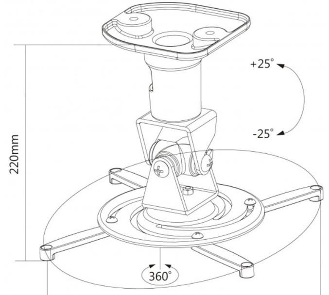 Stropní držák na dataprojektory - vzdálenost od stropu 22cm, přístroj lze otočit o 360° a naklonit +/-25°, maximální zatížení 15kg, kabelový prostup, vhodné i pro uchycení na šikmé plochy, bílý. Univerzální systém uchycení dataprojektorů (rozsah 18-31 cm)..