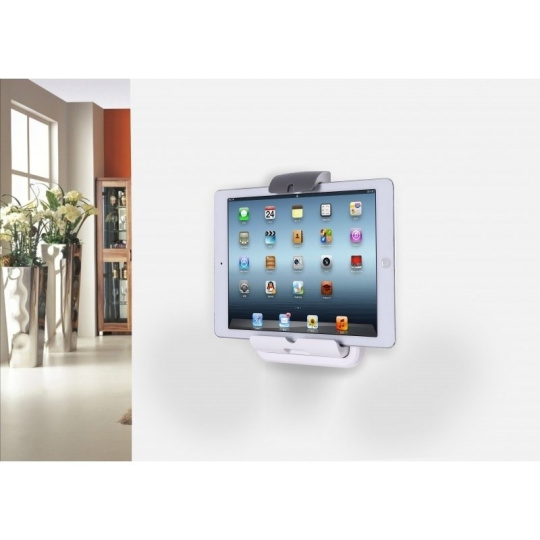 Stojánek pro tablety 7-11" v horizontální i vertikální poloze na zeď a kovovou plochu. 4x magnety a 2x vruty pro fixní uchycení, široká fixace tabletu ze dvou stran, lehké plastové provedení, šedý / bílý..