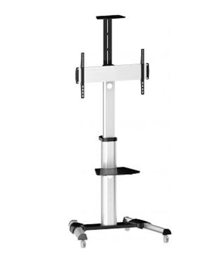 Moderní televizní stolek na Plasma a LCD TV s uhlopříčkou 37"- 70" (94-178cm) a hmotností maximálně 50kg. Středová teleskopická nosná tyč na kolečkách, držák otočný o 90° a vertikálně výklopný +5°/-12°, horní výškově nastavitelná plocha pro kameru, polička, AluDesign, barva stříbrná. Uchycení VESA: 200x200, 300x300, 400x200, 400x400, 600x400..