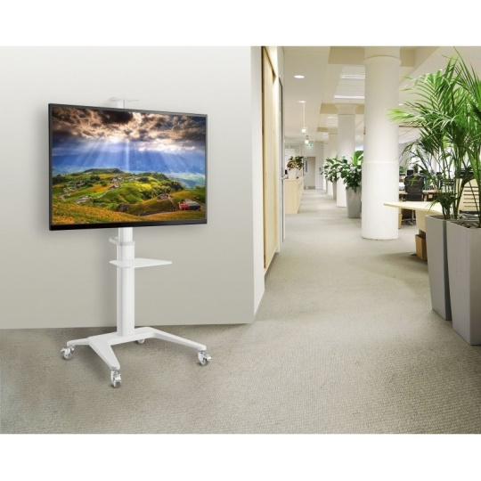 Televizní stolek na velké LCD TV s uhlopříčkou 37"- 70" (94-178cm) a hmotností maximálně 50kg. Středový nosný profil 125-160cm na kolečkách s aretací, držák výklopný +5°/-12°, horní výškově nastavitelná otočná plocha pro kameru max 5kg , polička 34x46cm max 5kg, Alu/ocel, barva bílá. Uchycení VESA: 200x200, 300x300, 400x200, 400x400, 600x400..