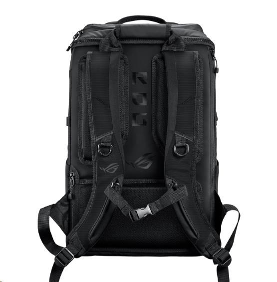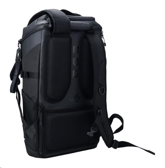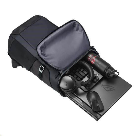 Herní batoh ROG Ranger BP2701 s objemem 22 litrů má velkou polstrovanou kapsu, do které se vejde až 17palcový notebook, a několik menších kapes na klávesnici plné velikosti, myš a podložku pod myš, headset, nabíječku a další vybavení.