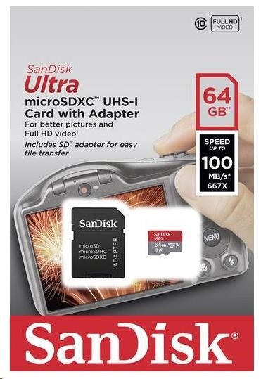 SanDisk MicroSDXC karta 64GB Ultra (100MB/s, A1 Class 10 UHS-I, Android - Imaging Packaging) + adaptér