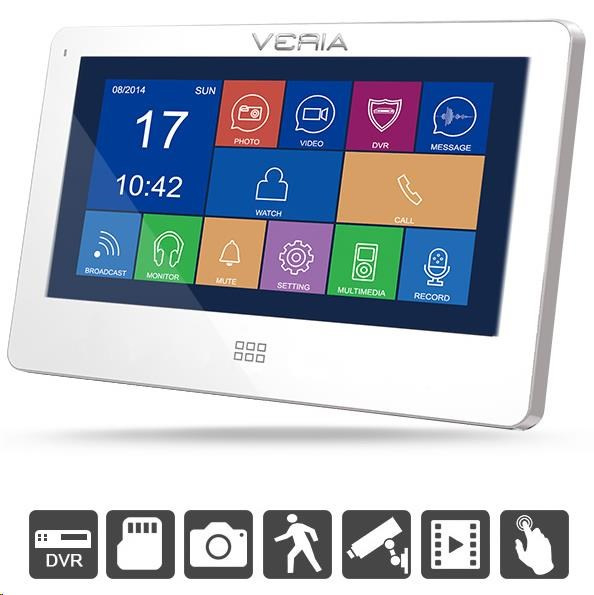 VERIA 7077 nabízí svému uživateli komfortní kombinaci videotelefonu a jednoduchého DVR monitorovacího systému s možností zachycení snímku nebo video záznamu využívající například tak sofistikované funkce, jako je detekce pohybu nebo podpora připojení externích CCTV kamer pro sledování okolí.