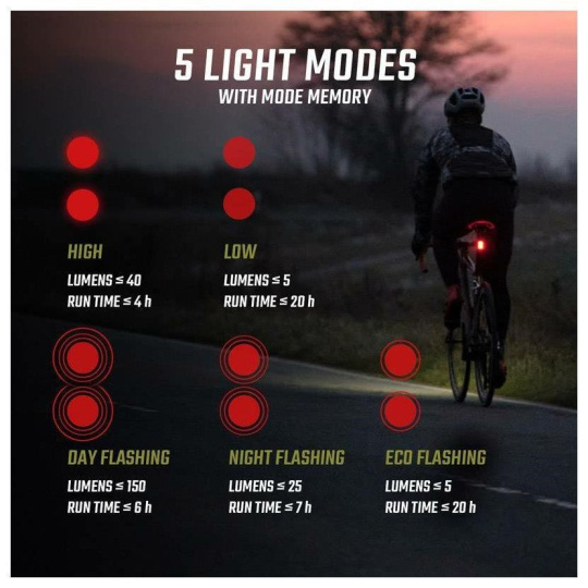 5 světelných režimů: High (40 lm), Low (5 lm), Day Flashing (150 lm), Night Flashing (25 lm), Eco Flashing (5 lm)