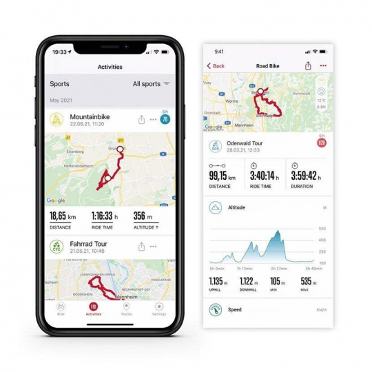 Na ROX 11.1 EVO jsou již nainstalovány čtyři profily, kterých však může být až 20. Můžete si vytvořit své vlastní sportovní profily a využívat tak svůj ROX 11.1 pro různé aktivity. Pomocí aplikace SIGMA RIDE lze individuálně konfigurovat a barevně zvýrazňovat šest různých tréninkových obrazovek až se šesti datovými poli. Tak budete mít dokonalý přehled o svých osobních cílech. Další obrazovky jsou nainstalovány prostřednictvím komoot pro trénink, trasu a navigaci. Pro chytré trenažéry připojené přes FE-C lze načíst další datovou obrazovku. ROX 11.1 lze propojit s chytrým telefonem a sledovat tak své výkony okamžitě na Live Screen aplikace SIGMA RIDE.