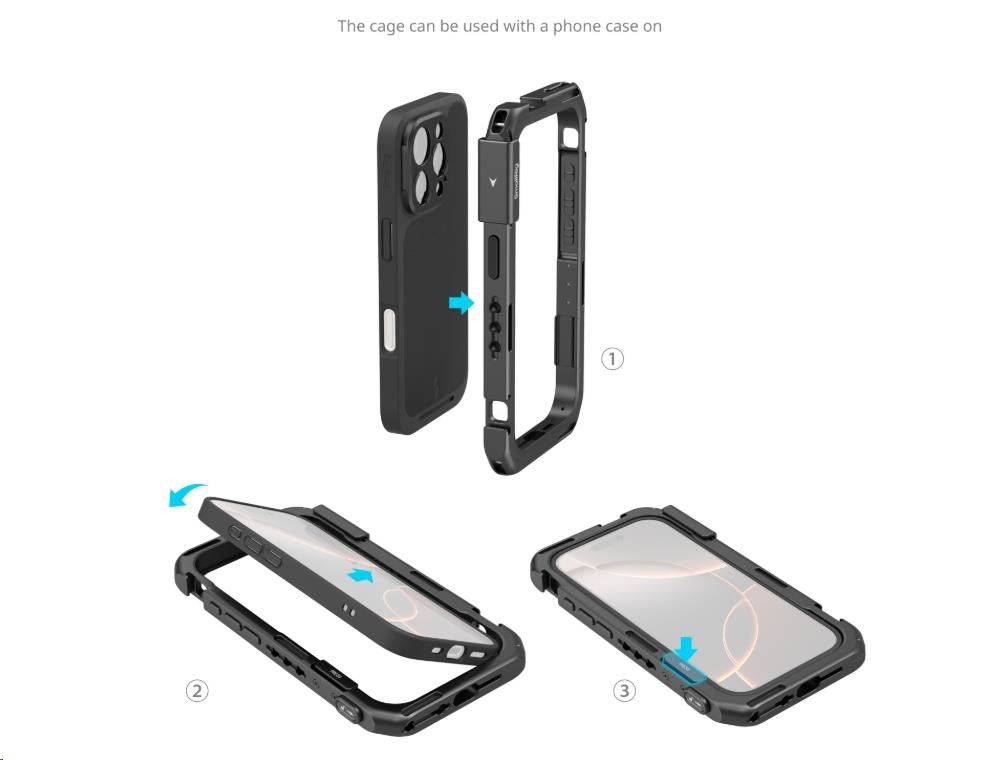 A dedicated mobile video cage for iPhone 16 Pro enables usage with protective phone cases for wide expansion options and all-around phone protection.