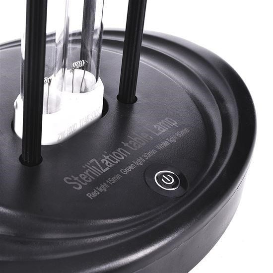 přenosná stolní lampa pro dezinfekci domácností, kanceláří, škol, chodeb, atd dezinfikuje vlivem UV-C záření a plynu O3 (ozon) inteligentní senzor, v případě přítomnosti lidí při dezinfekci se lampa sama vypne, následně se opět zapne velmi bezpečný a vysoce účinny způsob dezinfekce nezatěžuje životní prostředí a odpadové hospodářství použitými chemickými přípravky je až 3000x rychlejší než dezinfekce chlórem a 25x efektivnější než kyselina chloritá likviduje viry, plísně, bakterie, houby, hmyz. dezinfikovaná plocha: až 80m2 časovač 15/30/60min doporučená doba dezinfekce (časy jsou pouze orientační): místnost 40m2 - 15min místnost 50m2 - 30min místnost 80m2 - 60min vlnová délka 185nm, barva světla: modrofialová ozón a UV-C záření jsou zdraví nebezpečné, čtěte pozorně návod k použití doporučený interval pro dezinfekci: 1 - 3x týdně životnost zářiče: až 5000 hodin dosah dálkového ovládání: 20m materiál: křemíková trubice + ABS výkon zářiče: 100W napájení 230V/50Hz, délka přívodního kabelu 1,2m baterie dálkového ovládání: 1x CR2025 rozměry: 200x550mm hmotnost: 1,3 kg barva: černá.