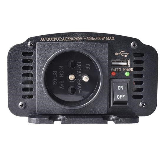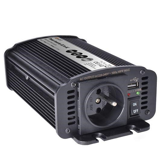 max. zatížení výstupu (stálé): 300W max. zatížení výstupu (ve špičce): 600W nominální vstupní napětí (DC): 12V nominální výstupní napětí (AC): 230V, 50Hz výstupní zvlnění má tvar modifikané sinusoidy napájení: DC 12V cigaretový autoadaptér (součástí balení) ochrana proti přehřátí, zkratům, přepětí, přetížení a vybití baterie pracovní teplota: -20°C až +50°C USB 2.0 nabíjecí výstup: 2100mA balení: barevná krabice.