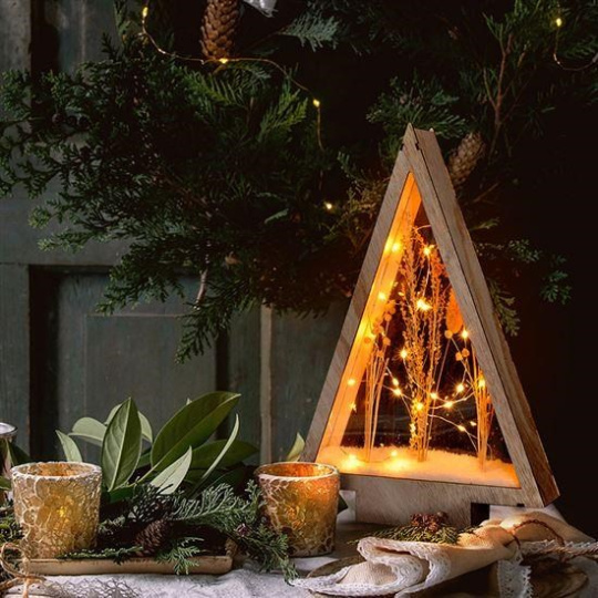 Přírodní, vánoční dřevěná dekorace ve tvaru vánočního stromku se zasněženými zimními květinami, podsvícené tenkým LED řetízkem