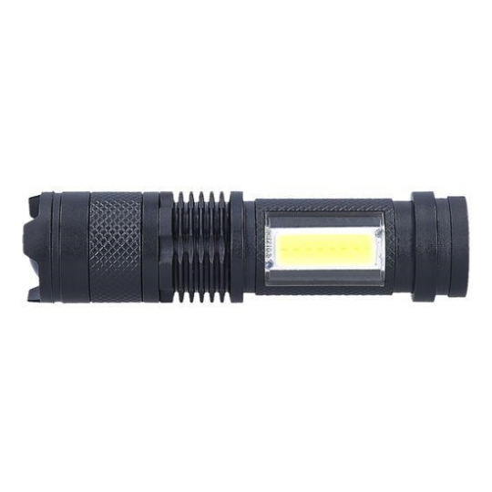 nabíjecí LED kapesní svítilna s USB konektorem svítivost: 100lm + 70lm (přední + boční) 3 režimy svícení: 100% přední , přerušované (blikání) přední, 100% boční outdoorové užití (stupeň krytí IP44) nastavitelný kužel světla (zoom) výdrž baterií min/max: 1hod./2hod. doba nabíjení: 2hod. baterie: 3.7V 400mAh Li-Ion napájení: USB konektor rozměry: 100 x 26mm barva: černá balení: display box 6ks.