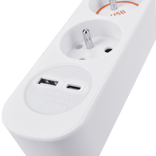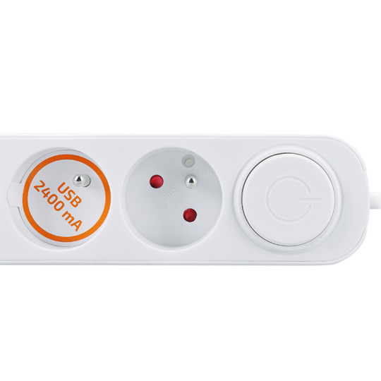 Kromě klasických zásuvek nabízí přívod také vestavěný USB adaptér s USB-A a USB-C porty, s celkovým výkonem až 12 W. Snadno tak nabijete telefon, tablet nebo jiná zařízení bez nutnosti hledat další nabíječku. Velký podsvětlený vypínač umožňuje rychlé odpojení všech připojených zařízení jedním stiskem.
