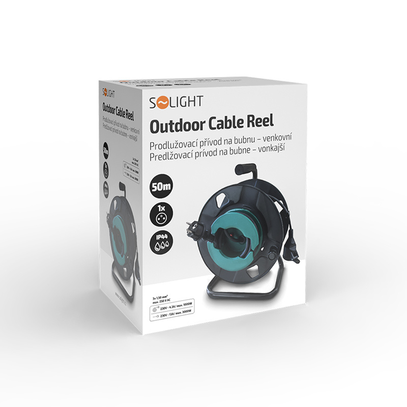 Solight prodlužovací přívod na bubnu, 1 zásuvka, venkovní, 50m gumový kabel, 3x 1,5mm2, IP44