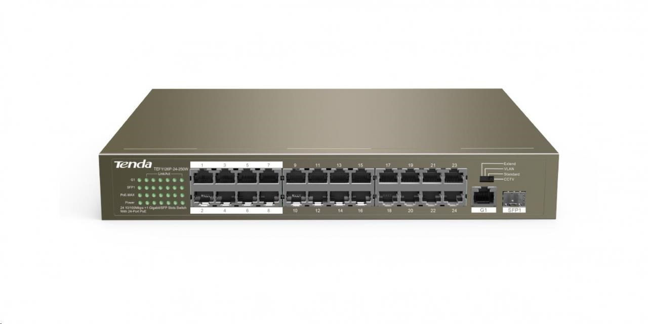 Tenda TEF1126P-24-250W přepíná data pomocí 26ti portů RJ45/SFP, 24 portů 10/100 Mb/s podporuje PoE802.3af/at + 1x RJ45 10/100/1000 Mb/s + 1x SFP 100/1000 Mb/s pro Uplink. Switch má ochranu proti přepětí 6kV. Podpora přepojování uzlů v módu Store-and-Forward a Cut-throught. Full-duplex kontrola toku 802.3x, half-duplex kontrola toku v režimu Back-Pressure. TEF1126P-24-250W je vhodná jak do menších a středních firem, tak i do domácností.