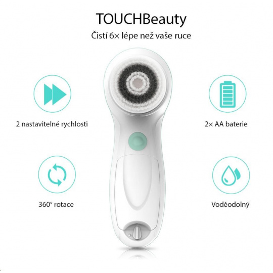 Elektrický čistící kartáček TOUCHBeauty 0759 nabízí tři různé nástavce, které odstraňují make-up, hloubkově čistí pleť a pomáhají s peelingem. Dvě pracovní rychlosti a velká ergonomická rukojeť zajišťují maximální komfort při každodenním používání. Díky voděodolnému provedení je čištění přístroje hračkou. Praktické pouzdro se hodí nejen pro ukládání přístroje a nástavců, ale i pro cestování.