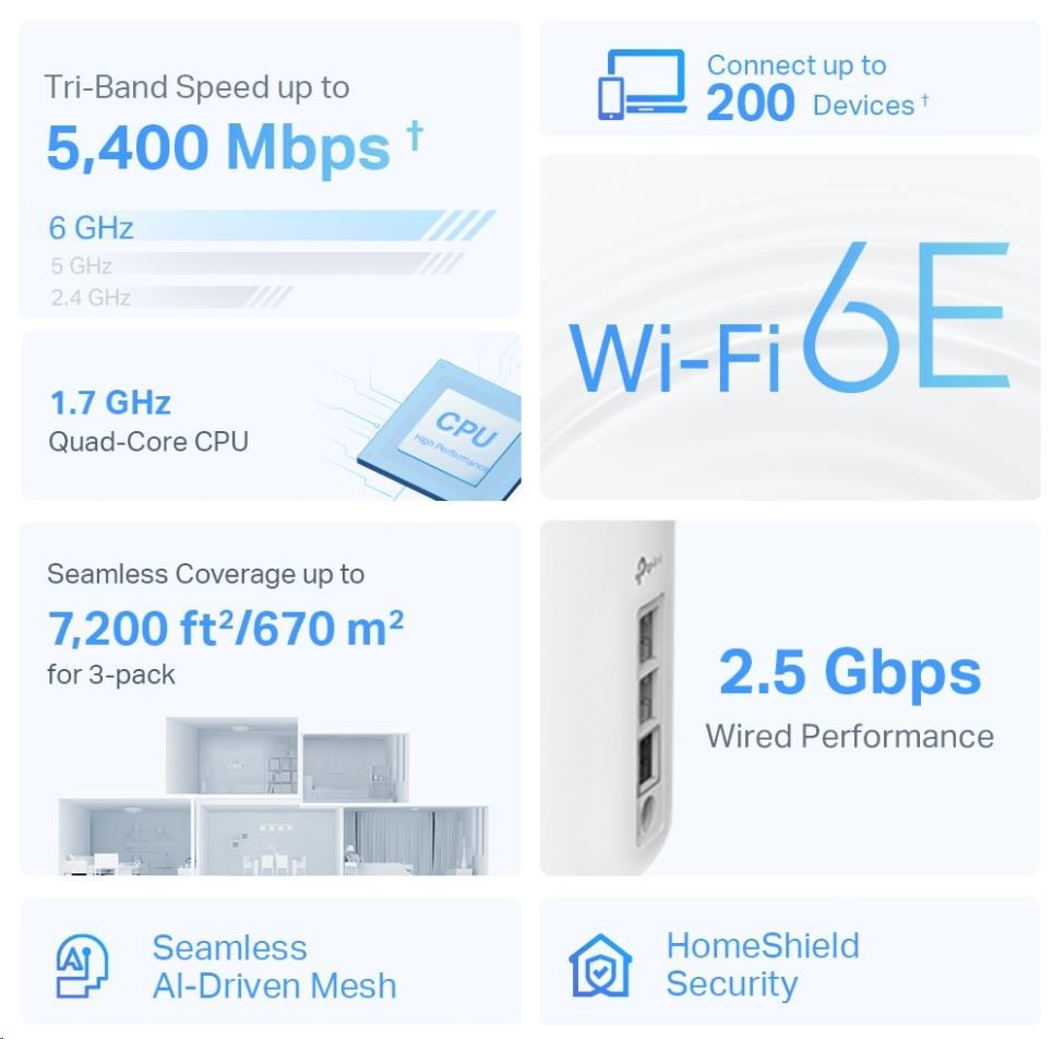 | WiFi Range | 1-3 Bedroom Houses (1-pack) TP-Link Mesh Technology Optional Ethernet backhaul work together to link Deco units to provide seamless coverage AI-Driven Mesh Intelligently learns the network environment to provide ideal Wi-Fi unique to your home 4× High-Gain Antennas (Internal) Multiple antennas form a signal-boosting array to cover more directions and large areas Tri-Band A newly-opened 6 GHz band brings more bandwidth and faster speeds Beamforming Concentrates wireless signal strength towards clients to expand WiFi range |