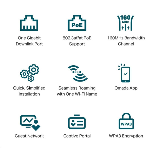 Typ aktivního prvku:AP (Access Point), MU-MIMO; Frekvenční pásmo (GHz):2,4, 5, 2,4 + 5 (Dual Band); Podporované standardy:802.11ax, 802.11b/g, 802.11b/g/n, 802.11b, 802.11a, 802.11a/n, 802.11g, 802.11n, 802.11ac; Zabezpečení:WPA-PSK, WPA2-PSK, WPA-Enterprise, WPA2-Enterprise, WPA3; Typ antény:Integrovaná; Použití:Vnitřní; Typy PoE:PoE - In.... více