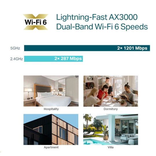 • Bleskurychlé přenosové rychlosti AX3000 Wi-Fi 6: Simultánní rychlosti 574 Mbit/s v pásmu 2,4 GHz a 2 402 Mbit/s v pásmu 5 GHz poskytují výslednou přenosovou rychlost 2 976 Mbit/s v síti Wi-Fi.