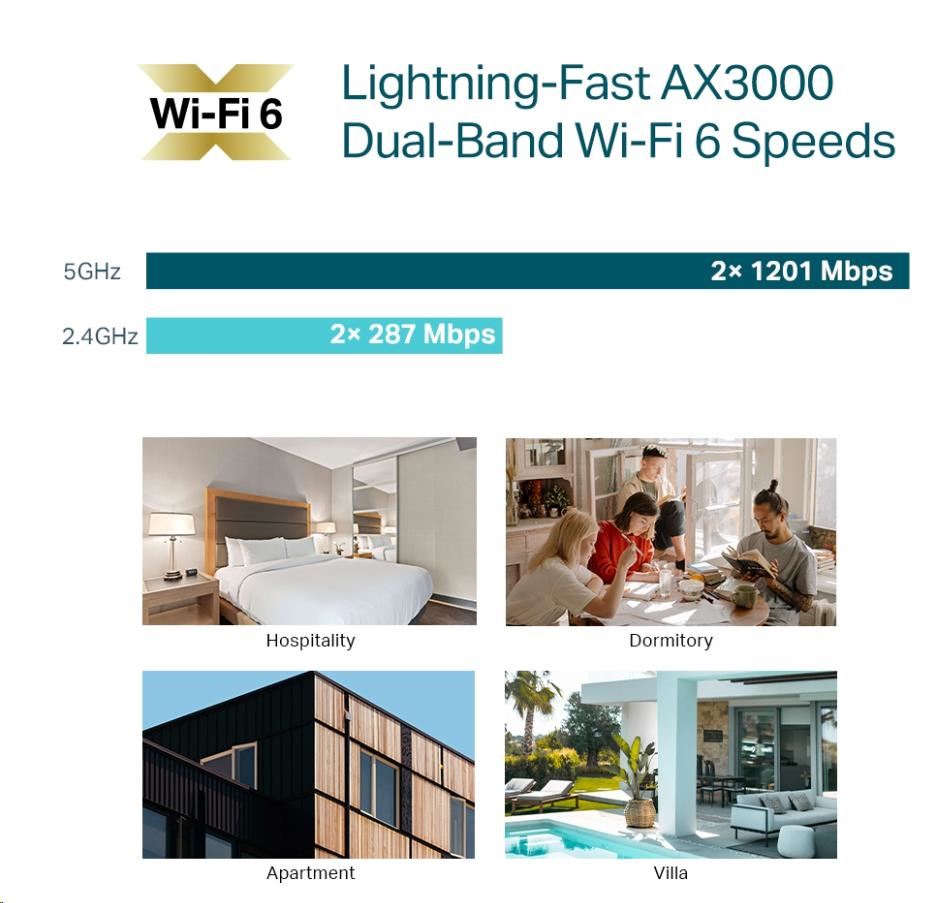 • Bleskurychlé přenosové rychlosti AX3000 Wi-Fi 6: Simultánní rychlosti 574 Mbit/s v pásmu 2,4 GHz a 2 402 Mbit/s v pásmu 5 GHz poskytují výslednou přenosovou rychlost 2 976 Mbit/s v síti Wi-Fi.