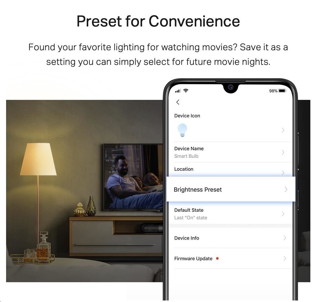 - Stmívatelná (nastavení pro vaše pohodlí) – Našli jste své oblíbené osvětlení pro sledování filmů? Uložte jej jako nastavení, které si můžete jednoduše vybrat pro budoucí filmové noci.