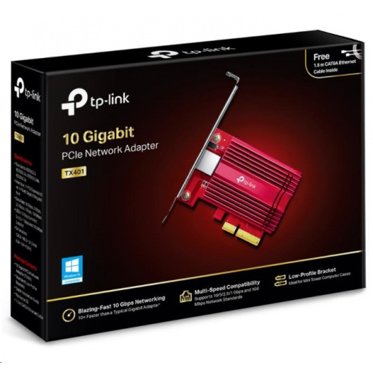 - Síť s rychlostí 10 Gbit/s – síťová karta TX401 dosahuje díky nejnovější technologii 10-GBase-T extrémních rychlostí až 10 Gbit/s, což představuje desetinásobek rychlosti typických gigabitových adaptérů. Zaručuje tím plynulé přenosy dat jak při přístupu na internet, tak i během přenosů v rámci lokální sítě.