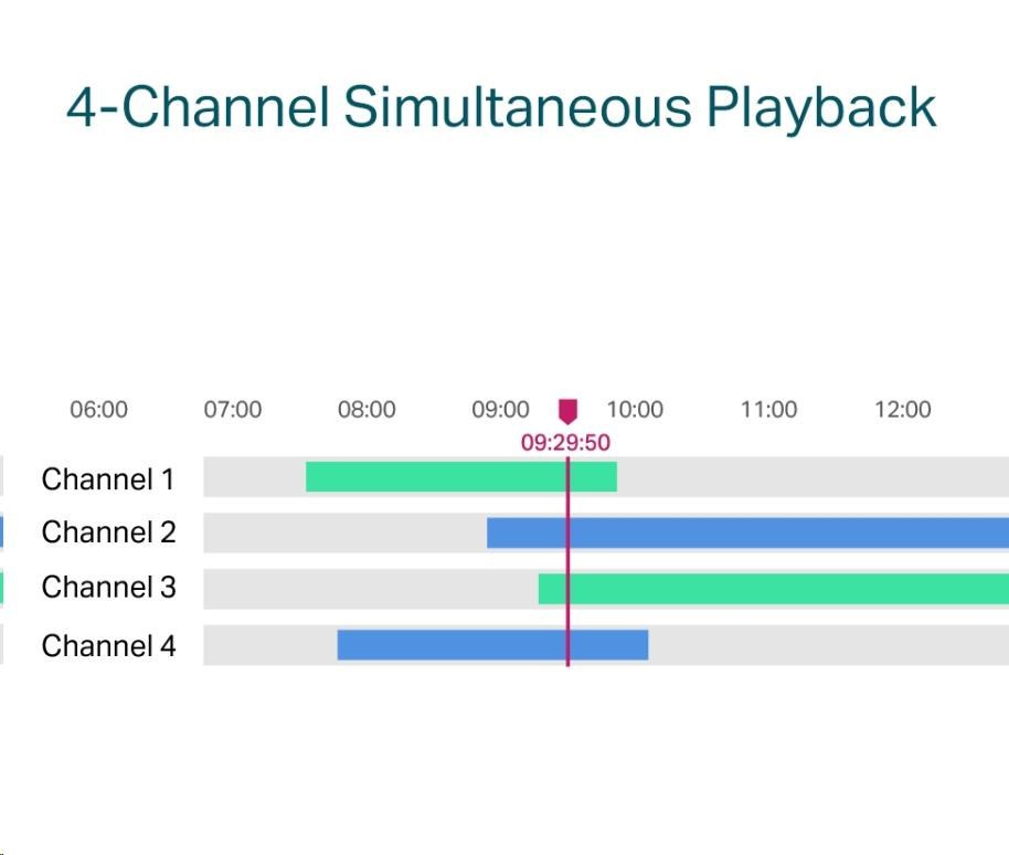 - 4-kanálové simultánní přehrávání - Přehrávejte záznam až ze 4 kamer současně, zvyšte rychlost přehrávání a vyhledejte události v plánu videa, abyste si mohli snadno prohlédnout záznam.