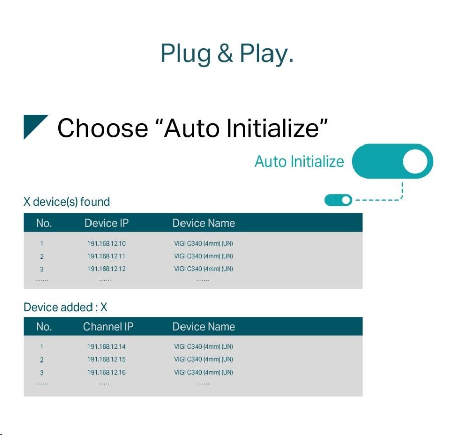 - Plug & Play - Umožňuje automatické přidávání nových a nepoužitých IP kamer VIGI do nového NVR a okamžitou aktivaci, takže instalace je rychlejší než kdykoli předtím.