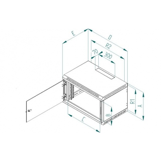 Rozvaděč Delta B je celosvařený nástěnný jednodílný rozvaděč s celoskleněnými dveřmi, které je možné díky masivním pantům otevřít pod úhlem téměř 180°. Důležitou součástí výrobku jsou otvory pro kabely, které jsou umístěny na horní a dolní stěně. Další dva otvory jsou umístěny na zadní stěně rozvaděče. Otvory jsou zaceleny vylamovacími záslepkami, které je možné vylomit s pomocí např. šroubováku. 19“ zařízení se instalují na vertikální lišty, které je možné plynule natavit podle potřeby do hloubky těla rozvaděče. Díky perforaci je zajištěna přirozená cirkulace vzduchu a chlazení komponentů. Přesné rozměry a další technické údaje jsou uvedeny níže (hodnoty R1 a R2 označují rozteče montážních otvorů pro zavěšení rozvaděče na zeď). Maximální zatížení rozvaděče je 30 kg. Rozměry: A – 635 mm B – 530 mm C – 490 mm D – 600 mm E – 395 mm R1 – 859 mm R2 – 420 mm Hmotnost – 20,5 kg Příbal: Klíč - přední dveře 2x Vrut 6x50 4x Podložka 6,6 4x Hmoždinka 10 4x Plastová podložka 8x Plovoucí matice M6 8x Šroub M6x16 8x Protiprachová záslepka 1x.