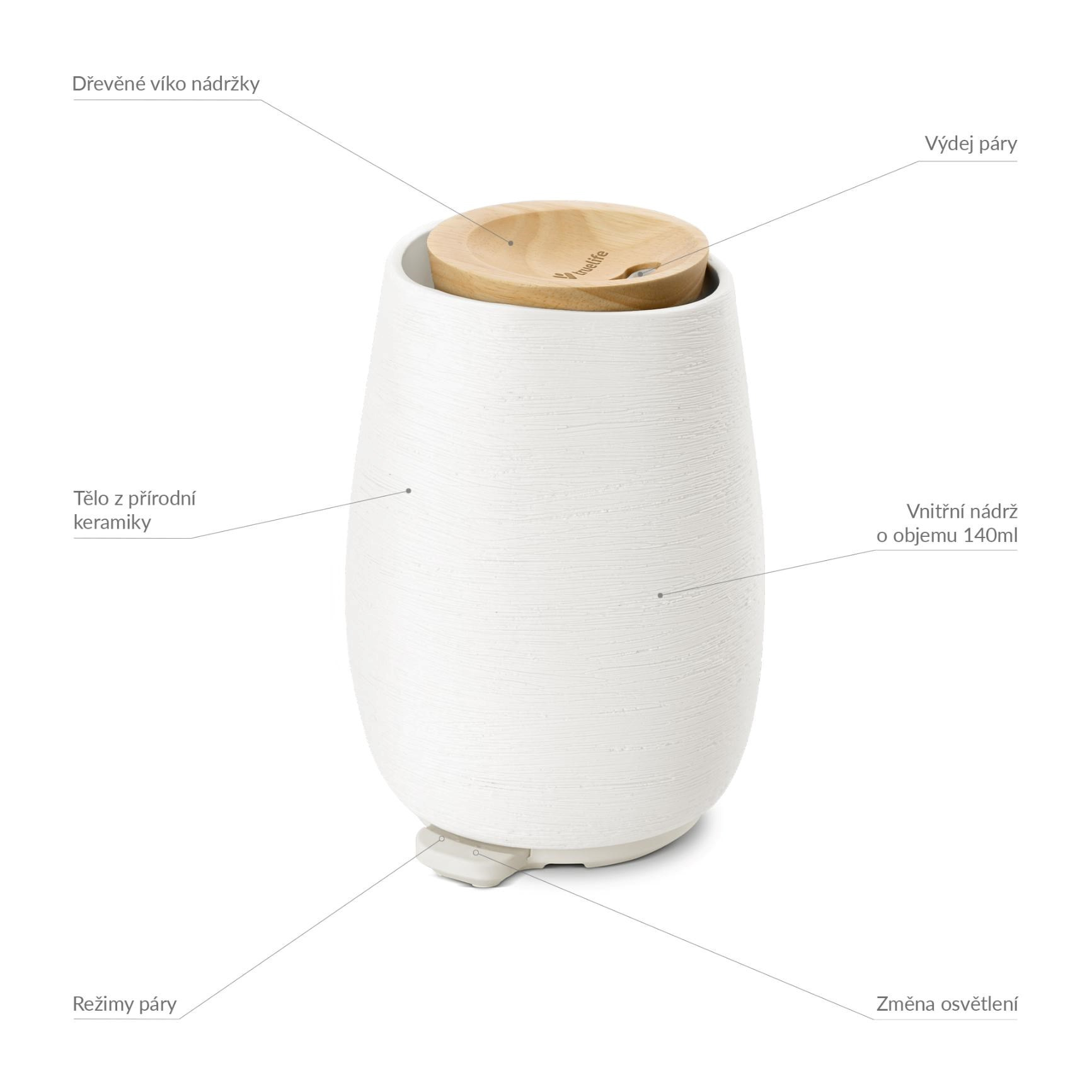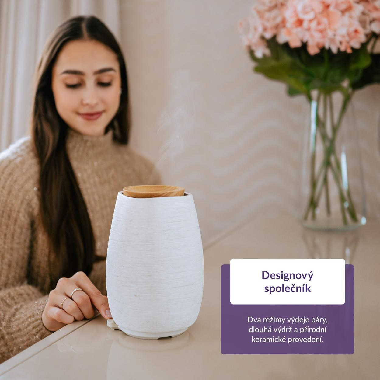 Difuzér pracuje zcela nehlučně, a to až 5 hodin. Jakmile klesne voda ve 140 ml nádržce pod určenou úroveň, přístroj se automaticky vypne. Naplnění oddělitelné nádržky je velmi snadné, podobně jako čištění či ovládání jediným tlačítkem.
