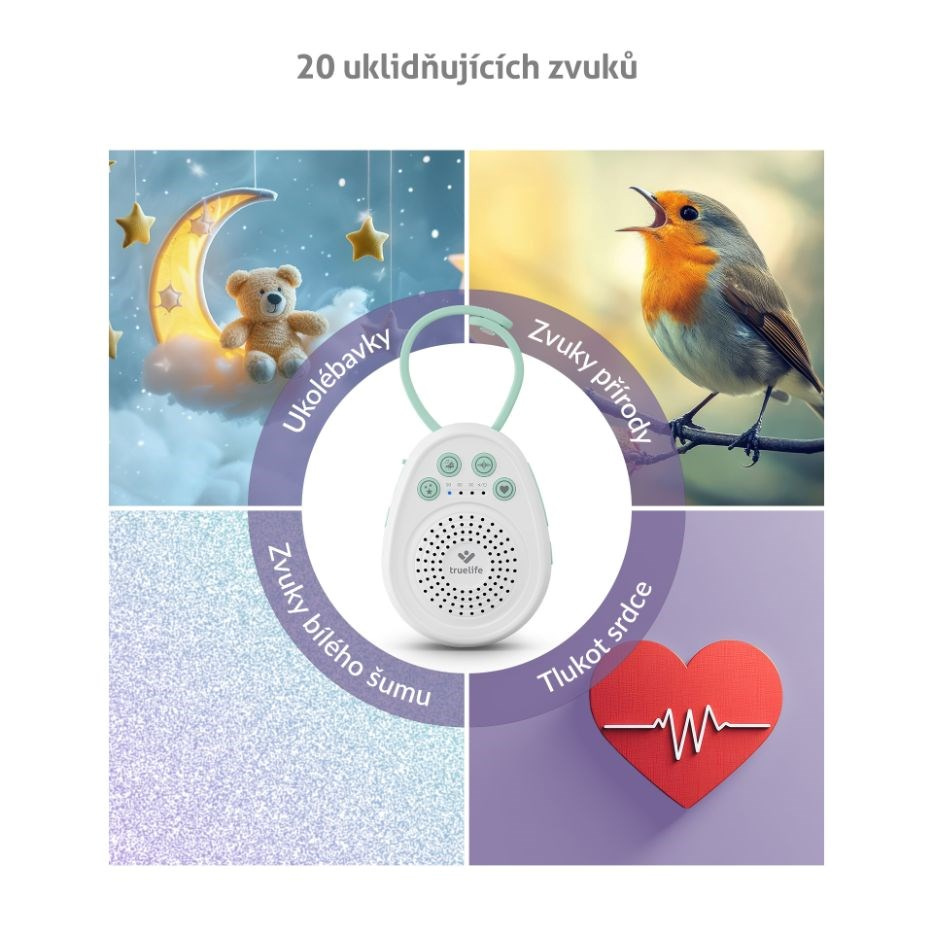 Miminka snáze usnou, když slyší příjemný zvuk a TrueLife BabyTone S3 jich nabízí hned 20. Na výběr máte 5 melodií, 9 zvuků přírody, 5 zvuků bílého šumu či tlukot srdce. Srdeční tep miminko uklidňuje už v prenatálním období a po narození mu připomíná bezpečí. Zvuk, který si miminko oblíbí, zní z kvalitního reproduktoru ve smyčce, dokud zařízení manuálně či za pomoci časovače nevypnete. Časovač lze nastavit na 30, 60 nebo 90 minut. Oblíbený zvuk netřeba vždy hledat, poslední použitý zůstane v paměti a po zapnutí se hned přehraje, takže si jen nastavíte potřebnou hlasitost.