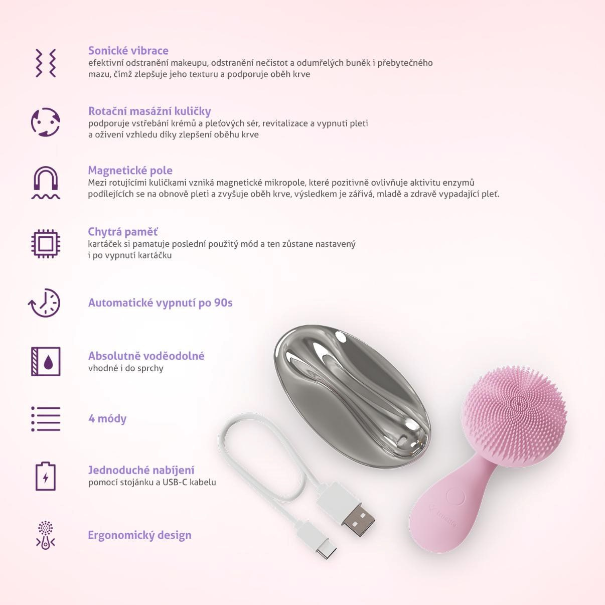 Čisticí kartáček pomocí sonických vibrací umí nejen dokonale vyčistit pleť, zbavit ji make-upu, nečistot, odumřelých buněk i přebytečného mazu, ale zároveň o ni pečuje. Jemné vibrace podporují prokrvení pleti a dochází ke zlepšení její textury. Obnovu pleti také podporují speciální rotační masážní kuličky mezi nimiž vzniká magnetické mikropole pozitivně ovlivňující aktivitu enzymů, jež se podílejí na revitalizaci pleti. Ta je poté zářivá a na první pohled zdravá a mladistvá.