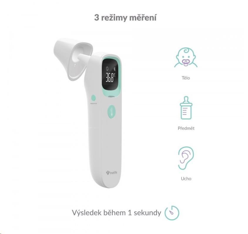 TrueLife Care Q10 BT nabízí tři režimy měření teploty. Kromě klasického měření tělesné teploty dokáže změřit i předměty, povrchy, nebo tekutiny. Snadno tak můžete zkontrolovat třeba kojeneckou stravu nebo čaj. U měření tělesné teploty osob máte možnost volby mezi měřením z teploty z ucha, nebo čela. Teploměr disponuje i dětským režimem, který je uzpůsoben pro osoby mladší 12 let.