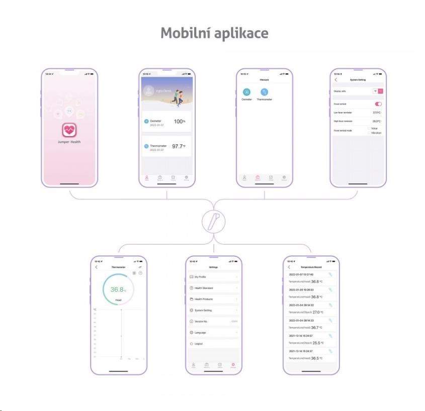 Díky zabudovanému Bluetooth lze teploměr spárovat s telefonem a hodnoty měření uchovávat v mobilní aplikaci.