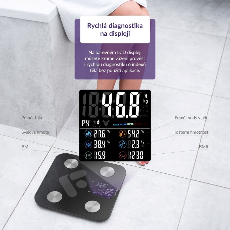 Představte si osobní váhu tak chytrou, že vám umožní dokonale poznat vlastní tělo. TrueLife FitScale W6 BT Black tohle umí. Velice přesně ukáže vaši aktuální hmotnost a přidá spoustu dalších užitečných informací díky bioelektrické impedanční analýze. Vše přehledně vidíte na barevném LCD displeji se 7 indexy těla. Váha je natolik inteligentní, že automaticky rozezná uživatele. Prémiové krycí sklo unese hmotnost až 180 kg. Váha postačí pro rychlou diagnostiku těla, ale pokud vás zajímá popis všech měřených indexů, skvělá je také mobilní aplikace. Stačí propojit váhu přes Bluetooth s telefonem a v aplikaci hned vidíte kompletní tělesný reporting i statistiky.
