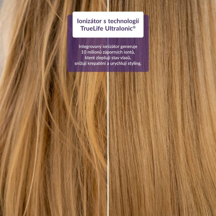Perfektní vlasy jako z titulky časopisů získáte rychle a v pohodlí domova. Žehlička je vybavena ionizátorem s technologií TrueLife UltraIonic®, který generuje 10 milionů záporných iontů zajišťujících, že se vlhkost z vlasů odpaří rychleji. Na vlas působí zevnitř a vy tak svůj vysněný účes vytvoříte během chvíle. Vaše vlasy budou vyživenější, zdravější, lesklejší, zkrátka zazáříte. Teplotu, kterou zřetelně zobrazuje velký LED displej, si nastavíte sobě na míru. K dispozici je až 12 možností nastavení teploty v rozsahu od 120 °C do 230 °C.