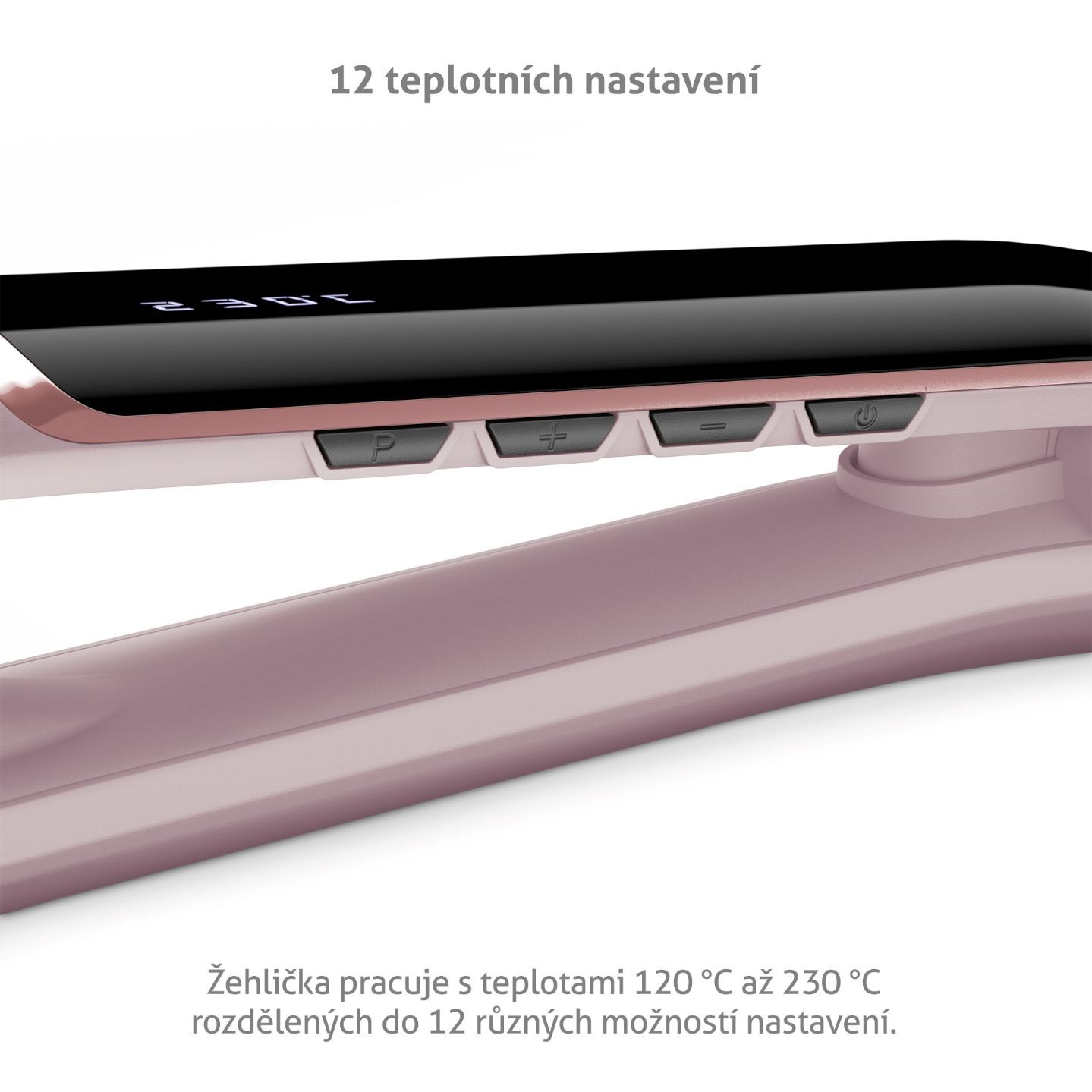 Žehlička pracuje s teplotami 120 °C až 230 °C rozdělených do 12 různých možností nastavení.