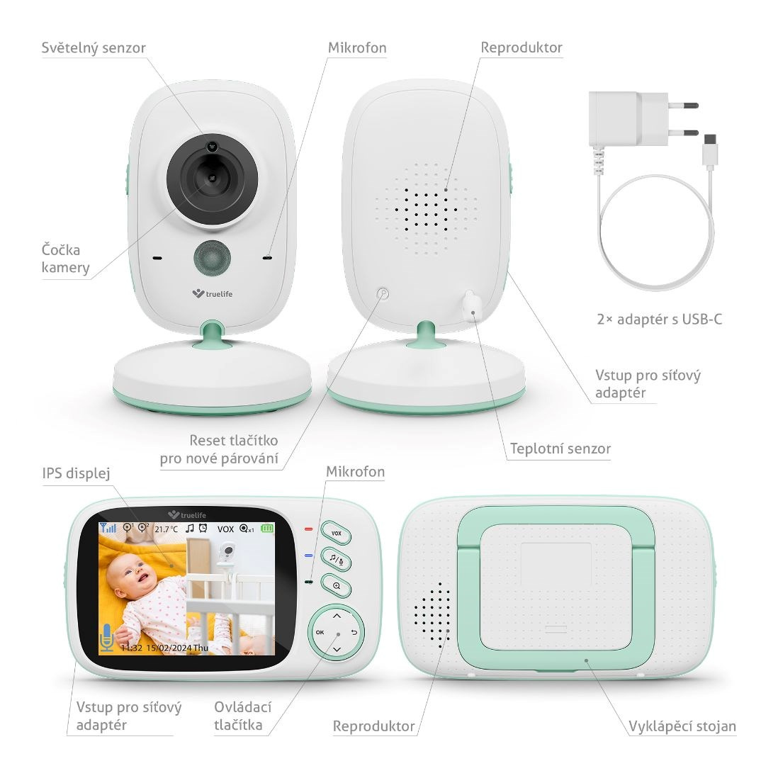 Nebojte se, že by se chůvička jen tak vybila, její baterie s nyní daleko větší kapacitou 1000 mAh (u předchozího modelu byla pouze 750 mAh) vydrží až 4,5 hodiny a v případě, že aktivujete úsporný VOX režim šetřící baterii, vydrží její kapacita až na 20 hodin. I když je úsporný režim aktivován, přesto vám nic neunikne. Jakmile chůvička detekuje zvuk, displej rodičovské jednotky se okamžitě rozsvítí. Zatímco rodičovskou jednotku si postavíte díky praktickému stojánku, na dětskou jednotku si u této chůvičky můžete dokoupit velmi flexibilní držák TrueLife NannyCam H32 Holder. Ten snadno obmotáte kolem postýlky a pak si jen kameru naklopíte dle potřeby. Pro dobití chůvičky využijete USB-C kabel.