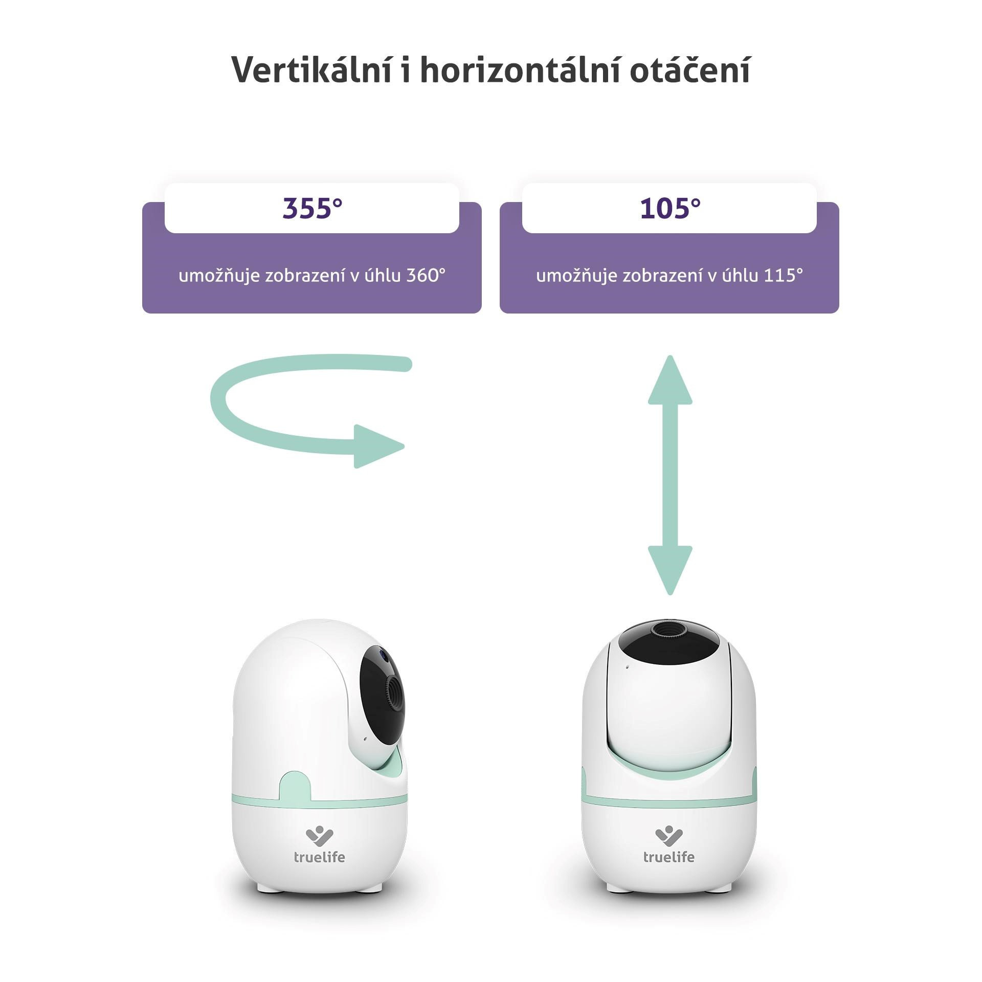 Kamera chůvičky se umí otáčet horizontálně o 355° a vertikálně o 105°. Díky širokému pozorovacímu úhlu ale umožní vidět celých 360° horizontálně a 115° vertikálně. Rozhodně vám tedy nic neunikne, dohlédnete do každého zákoutí.