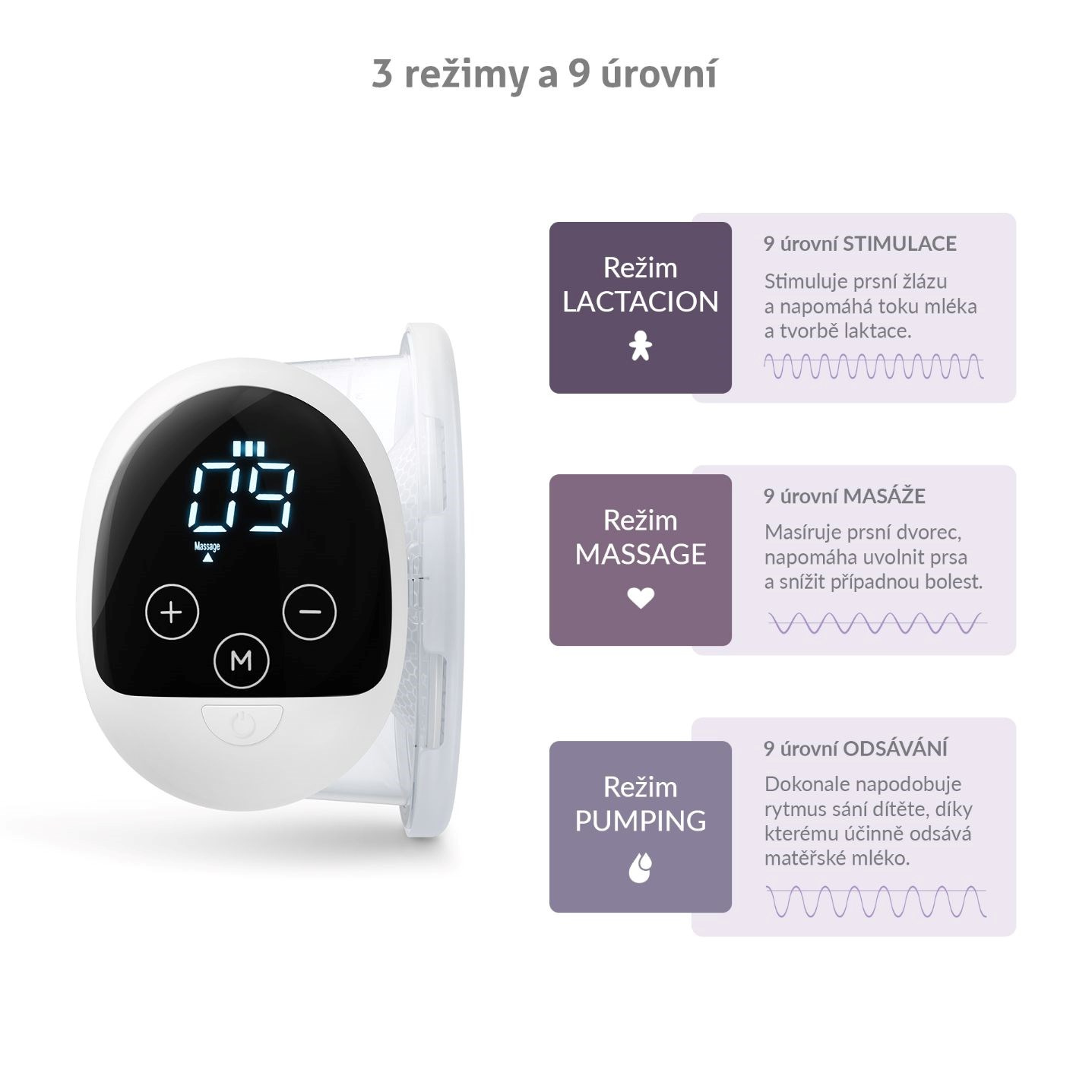 3 režimy pro stimulaci, úlevu a odsávání