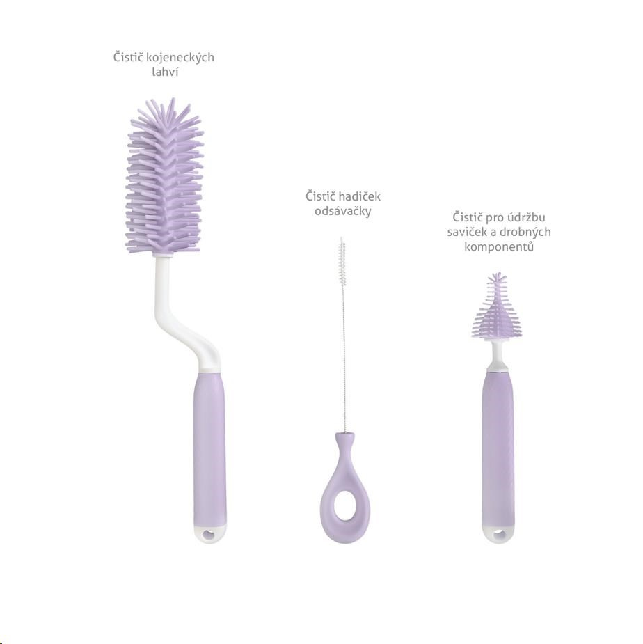 Pomocí setu na čištění jednoduše zbavíte nečistot nejrůznější typy lahví, saviček, příslušenství, ale i dalších předmětů pro děti. Nezáleží přitom na tom, z jakého materiálu jsou vyrobeny, silikonové štětinky jsou šetrné ke sklu, hliníku, keramice, plastu i dalším materiálům. Díky otočné rukojeti se navíc při umývání nikterak nenadřete, minimalizuje totiž únavu rukou.