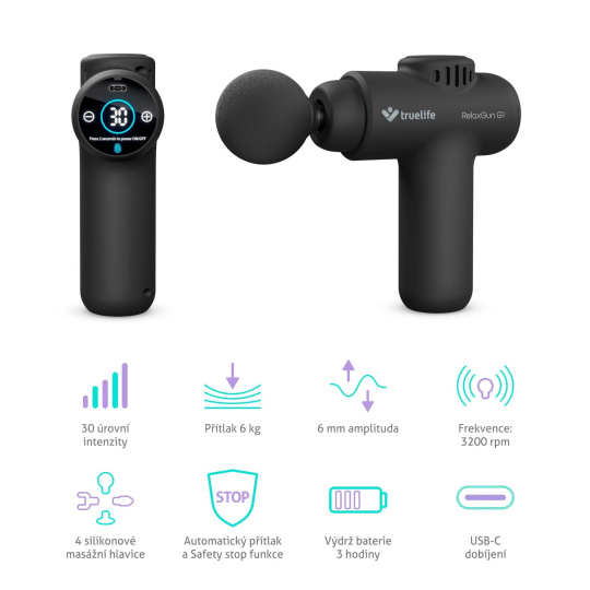 Ať už sportujete na vrcholové úrovni, pracujete jako fyzioterapeut, trávíte většinu dne u počítače, nebo jen hledáte efektivní způsob, jak ulevit unaveným svalům, masážní pistole TrueLife RelaxGun G1 je ideální volbou pro regeneraci i relaxaci. Nabízí 30 úrovní intenzity, přítlak 6 kg a frekvenci až 3200 kmitů za minutu, takže se snadno přizpůsobí vašim potřebám – od jemné relaxační masáže až po intenzivní hloubkovou terapii. Čtyři vyměnitelné silikonové hlavice umožňují cílenou péči o různé části těla, zatímco inteligentní funkce jako automatický frekvenční přítlak a bezpečnostní zastavení (Safety stop) zajistí maximální komfort a bezpečí. S tichým provozem, dlouhou výdrží baterie až 3 hodiny a moderním USB-C nabíjením je TrueLife RelaxGun G1 ideálním pomocníkem doma, ve fitku, v práci i na cestách. Dopřejte si péči kdykoliv potřebujete – pro rychlou regeneraci, úlevu od bolesti, prevenci zranění i podporu celkové pohody.