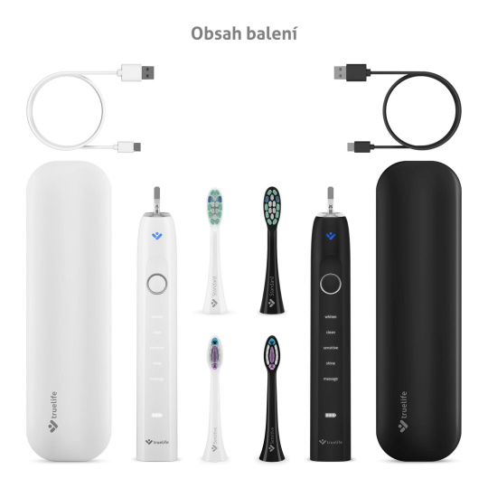 Zdravý úsměv je vizitkou nás všech. S balením dvou sonických kartáčků TrueLife SonicBrush Clean70 UV Duo bude péče o zuby a dásně nejen důkladná, ale navíc i příjemná. Každý z kartáčků čistí zuby rychlostí až 90 000 pohybů za minutu, čímž odstraní až 12× více zubního plaku než manuální kartáček. Sonická technologie SonicTrue® jemnými vibracemi čistí plošky zubů a díky víření vody s pastou vytváří mikrobublinky, které proniknou i do mezizubních prostor. Tlakový senzor s technologií SmartPressure® hlídá ideální tlak a varuje před nadměrným zatížením dásní či skloviny. Dobíjecí pouzdro s UV sterilizací efektivně ničí až 99,9 % bakterií a virů na hlavicích. Kartáčky vydrží až 70 dní na jedno nabití, disponují 5 režimy čištění a 2 typy hlavic (Standard a Sensitive). Chytrý časovač hlídá doporučené 2 minuty čištění a funkce paměti uchová poslední zvolený režim. Díky vysoce citlivému vibračnímu senzoru se kartáček automaticky aktivuje a rozsvítí, jakmile jej vezmete do ruky. Speciální jemně pogumovaná povrchová úprava rukojeti je příjemná na dotek a zabraňuje klouzání i při použití s vodou.