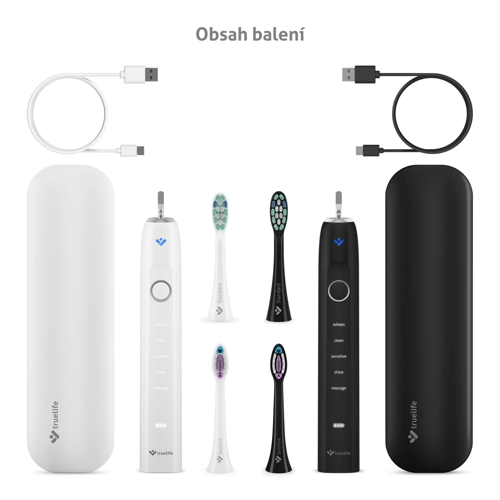 Zdravý úsměv je vizitkou nás všech. S balením dvou sonických kartáčků TrueLife SonicBrush Clean70 UV Duo bude péče o zuby a dásně nejen důkladná, ale navíc i příjemná. Každý z kartáčků čistí zuby rychlostí až 90 000 pohybů za minutu, čímž odstraní až 12× více zubního plaku než manuální kartáček. Sonická technologie SonicTrue® jemnými vibracemi čistí plošky zubů a díky víření vody s pastou vytváří mikrobublinky, které proniknou i do mezizubních prostor. Tlakový senzor s technologií SmartPressure® hlídá ideální tlak a varuje před nadměrným zatížením dásní či skloviny. Dobíjecí pouzdro s UV sterilizací efektivně ničí až 99,9 % bakterií a virů na hlavicích. Kartáčky vydrží až 70 dní na jedno nabití, disponují 5 režimy čištění a 2 typy hlavic (Standard a Sensitive). Chytrý časovač hlídá doporučené 2 minuty čištění a funkce paměti uchová poslední zvolený režim. Díky vysoce citlivému vibračnímu senzoru se kartáček automaticky aktivuje a rozsvítí, jakmile jej vezmete do ruky. Speciální jemně pogumovaná povrchová úprava rukojeti je příjemná na dotek a zabraňuje klouzání i při použití s vodou.