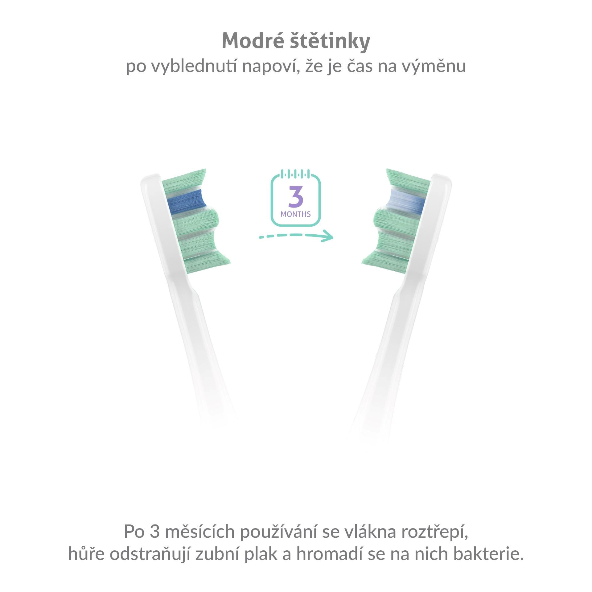 V balení najdete pro každý kartáček 2 náhradní hlavice, z čehož jednu využijete pro každodenní čištění (Standard), druhou pro citlivé zuby (Sensitive). K dokoupení jsou i hlavice Whiten na bělení zubů.