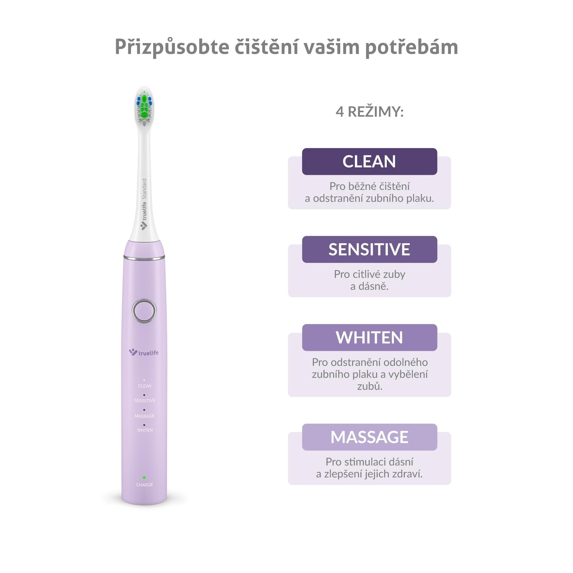 SonicBrush Compact Lavender v sobě má 4 režimy čištění, které se komplexně postarají o vaše ústa. Režim Clean je nejběžnější a hodí se pro každodenní používání. Citlivé zuby a dásně můžete s klidem svěřit režimu Sensitive. Ke krásnému bílému úsměvu vám pomůže režim Whiten a příjemnou masáž dásní zajistí režim Massage.
