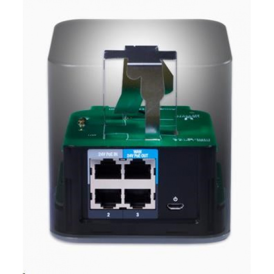 Napájení routeru je možné řešit jak přes napájecí adaptér, který není součástí balení, tak i pomocí 24V pasivního injektoru zapojeného do portu LAN, čímž bude možné napájet i venkovní jednotku jako např.: Loco, PowerBeam, NanoBeam a jiné klientské jednotky.