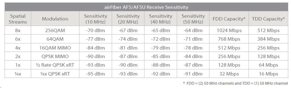 Krom standardní podpory TDD a FDD přišel airFiber s novou techologií HDD (Hybrid Division Duplexing). Nová technologie xRT (eXtended Range Technology) umožňuje maximální dosah až 100+km. Toto spolu s dalšími inovativními technologiemi a systémem AirOS tvoří jedinečný rychlý páteřní spoj s jednoduchou instalací a správou.