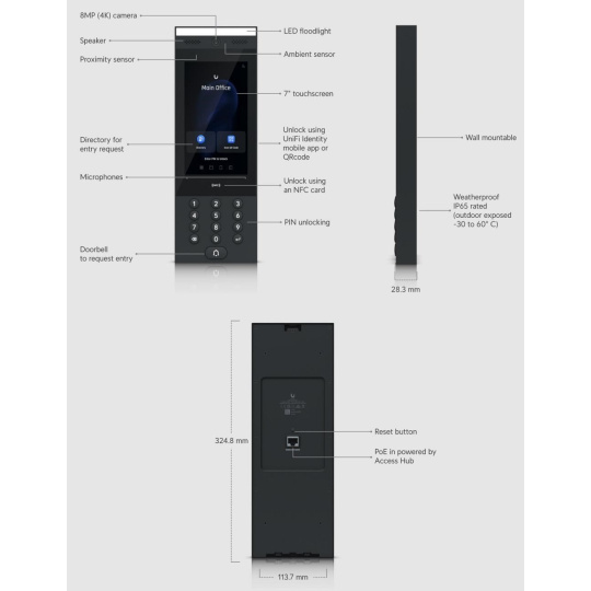Popis produktu UA-Intercom je zbrusu nový špičkový video interkom vhodný jak pro vnitřní, tak venkovní použití (operační teplota -30°C až +60°C), ideální pro řízení vstupů do rezidenčních i komerčních objektů.  Interkom kombinuje robustní a odolnou konstrukci s pokročilými funkcemi pro zajištění bezpečného a pohodlného přístupu. Tento interkom umožňuje odemčení přístupu pomocí různých metod, - NFC kartou, mobilní aplikací UniFi Identity, PIN kódem nebo QR kódem, což umožňuje flexibilitu výběru preferované metody.  Díky vestavěnému adresáři a funkci zvonku mohou návštěvy snadno komunikovat s uživateli, kteří jim mohou umožnit vstup. Jeden interkom lze také propojit s více domácími video telefony, takže ani instalace v bytových domech není překážkou.  Jeho snadná instalace a napájení pomocí Power over Ethernet (PoE) prostřednictvím UA-Hub umožňují implementaci v existujících i nových systémech. UA-Intercom je navržen tak, aby splňoval náročné požadavky na spolehlivost a výkon, poskytující bezpečnost a pohodlí pro uživatele.  Vylepšete svůj systém kontroly přístupu a komunikace s UA-Intercom od Ubiquiti - spojení bezpečnosti, pohodlí a moderní technologie ve vaší budově.  Klíčové vlastnosti Odemykání pomocí NFC karty, UnFI Identity mobilní aplikace, PIN kódi nebo QR kódu Adresář a funkce zvonku pro umožnění vstupu Připojení k UniFi Access Hub, napájení přes POE Odolný design pro vnitřní i venkovní použití Dotykový displej Integrovaná kamera Obousměrné audio   Obsah balení Interkom Držák na zeď Vrtací šablona Montážní sada  Technické parametry Kamera Přísvit:Bílé světlo Pozorovací úhel [°]:79 Obraz Max. rozlišení [pixely]:3264 x 2448 Konektory a rozhraní Audio:Mikrofon, Reproduktor Napájení Napájení přes PoE:48V DC Typ napájení:PoE Max. spotřeba energie [W]:13 Fyzické charakteristiky Stupeň krytí:IP65 Použití:Venkovní Provozní teplota [°C]:-30 až 60 Šířka [mm]:114 Výška [mm]:325 Hloubka [mm]:28.