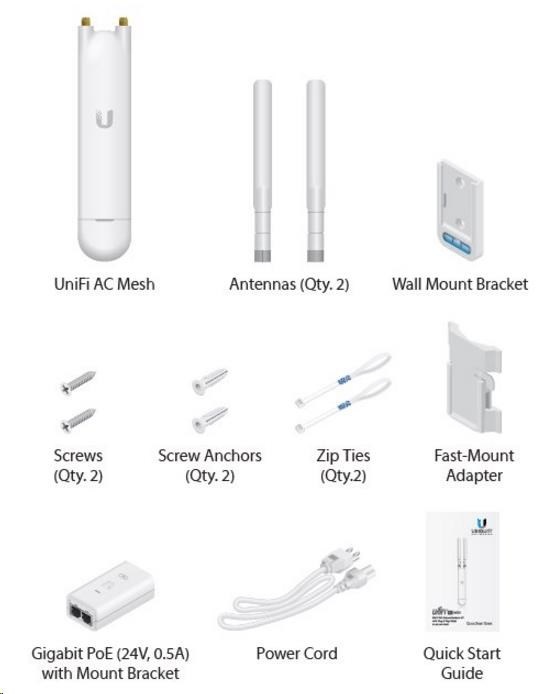 UniFi AP AC Mesh je venkovní voděodolné mesh AP s celkovou propustností až 1167Mbps (2.4GHz 300Mbps + 5GHz 867Mbps), Disponuje 2x2MIMO všesměrovými dualband. 3dBi (4dBi pro 5GHz) antény s výkon rádia 20dBm jak pro 2,4 tak i 5GHz současně. Podporuje standardy 802.11a/b/g/n/ac, disponuje jedním gigabit.ethernet. portem. Lze napájet prostřednictvím aktnivního PoE dle 802.3af případně pasivního (24V DC), PoE adaptér je součástí balení (pasivní). Maximální spotřeba činní 8,5W.