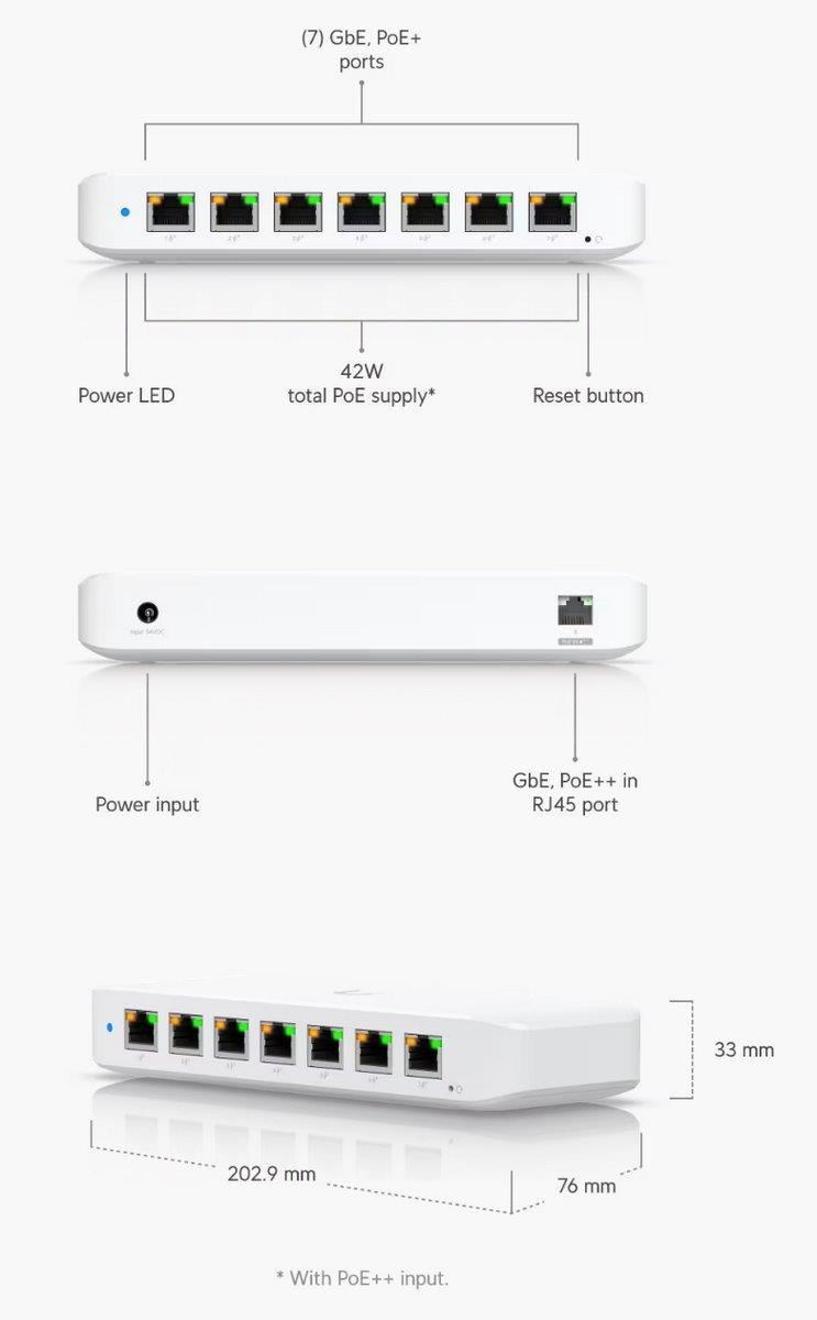 Popis produktu Kompaktní 8 portový gigabitový PoE switch. Switch disponuje 1 PoE in portem a 7 PoE out porty s podporou PoE napájení 802.3af/at s maximálním zatížením až 30W na port. Switch je spravován pomocí aplikace UniFi network umožňující centrální správu Vaší sítě včetně cloudového přístupu. Maximální PoE budget switche je závislý na způsobu napájení: • při napájení DC adaptérem 54V/3,9A (součástí balení) je PoE budget 202W • při napájení pasivním PoE adaptérem nebo 60W PoE++ adaptérem je PoE budget 45W Obsah balení • switch • napájecí adaptér 54V/3,9A • montážní set Technické parametry Konektory a rozhraní Rychlost LAN:(8) 10/100/1000Mbps Napájení Typ napájení:DC konektor, PoE Typy PoE:PoE-Out + PoE-In Podporované PoE-Out standardy:802.3af, 802.3at Počet PoE Out portů:7 PoE budget [W]:202 Max. spotřeba energie [W]:60 Napájení přes konektor/svorkovnici:44 .. 57V DC Fyzické charakteristiky Provedení:Na zeď, Desktop Ventilátory:Bez ventilátoru Šasi:Plastové Tlačítka:Reset Provozní teplota [°C]:-15 až 45 Šířka [mm]:203 Výška [mm]:33 Hloubka [mm]:76 Obecné Rychlost přepínání [Gbps]:8 Software Management:UniFi controller Funkce:VLAN.