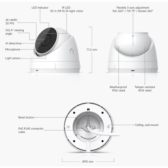 Popis produktu UVC-G5-Turret-Ultra je kamera 5. generace z řady UniFi Video. Disponuje snímačem 1/2.4" CMOS s rozlišením 4MP (2688 x 1512 px, 16:9) @ 30 FPS. Fixní objektiv má pozorovací úhel 102,4° horizontálně, 54,9° vertikálně a 120,6° diagonálně. Kamera je vybavena mikrofonem (lze zakázat) a (1) 10/100Mbps ethernetovým portem, skrze který se kamera napájí za použití POE 802.3af nebo pasivní POE se vstupním napětím 37 - 57 V DC. Pro noční režim je kamera vybavena IR přísvitem s dosahem 30 m. Maximální spotřeba činí pouhé 4 W!  Obsah balení Kamera Voděodolná průchodka Kovový držák Sada šroubů a matic s metrickým závitem Sada vrutů a hmoždinek Vrtací šablona Bezpečnostní závlačka  Technické parametry Kamera Typ objektivu:Fixní Přísvit:IR Dosah přísvitu [m]:30 Pozorovací úhel [°]:102 Režim den/noc:IR cut filtr Obrazový senzor ["]:1/2.4 Obraz Rozlišení:4MP Max. rozlišení [pixely]:2688 x 1512 Konektory a rozhraní Audio:Mikrofon Rychlost LAN:(1) 10/100Mbps Napájení Napájení přes PoE:802.3af, 37 .. 57V DC Typ napájení:PoE Max. spotřeba energie [W]:4 Fyzické charakteristiky Stupeň krytí:IP66 Použití:Venkovní Antivandal (ochrana proti nárazu):IK4 Tlačítka:Reset Provozní teplota [°C]:-30 až 50 Hmotnost [g]:330 Šířka [mm]:90 Výška [mm]:71 Hloubka [mm]:90 Barva:Bílá Obecné Kamerová řada:UniFi Protect.